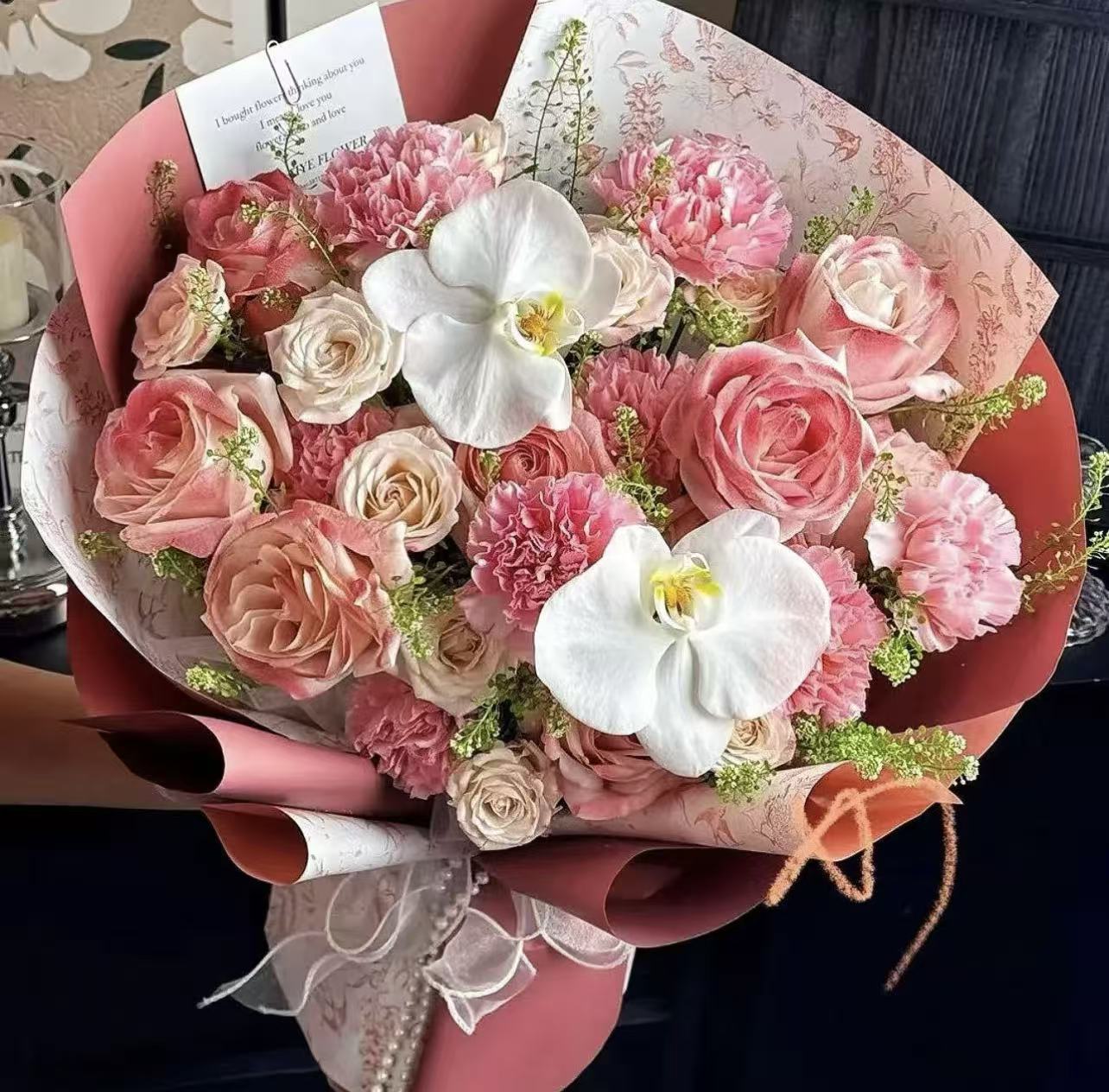 【云鬓簪春】6枝粉色康乃馨混搭蝴蝶兰鲜花花束送妈妈生日礼物惊喜花束鲜花花束鲜花店配送上门